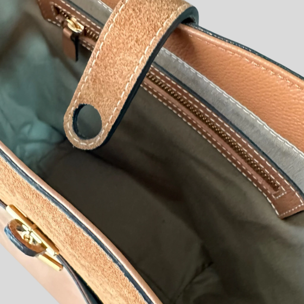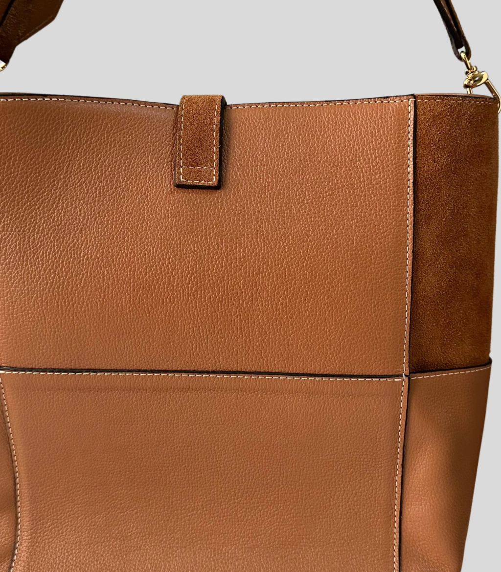 Essa shopper bag deixa qualquer look mais cool, despojado e estiloso. A combinação do couro liso com o couro camurça, faz uma brincadeira de texturas, trazendo aconchego. O toque de elegância fica por conta do seu sistema de fechamento, que é feito pelo encaixe do pingente em T, o clássico da TH.