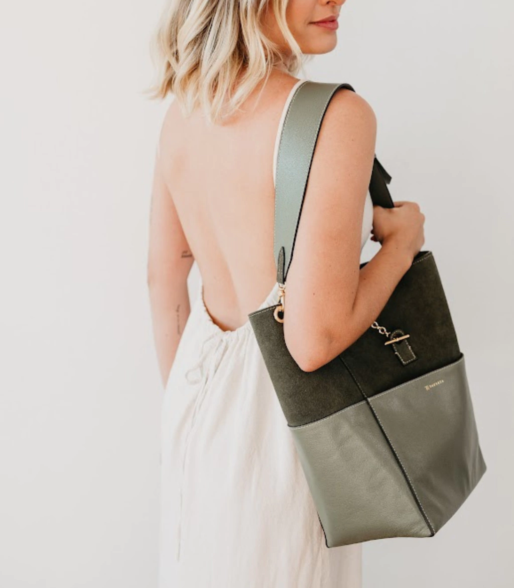 A nossa shopper bag Amis é feita à mão e em couro legítimo bovino, nas cores: Sálvia e Havana. Seu fecho é de encaixe e seu forro é 100% algodão, na cor cappuccino. Possui três bolsos externos e um bolso interno com zíper, ideal para comportar documentos, cartões e dinheiro. Sua alça de ombro é ajustável com 7 regulagens. Quanto às suas dimentões externas: