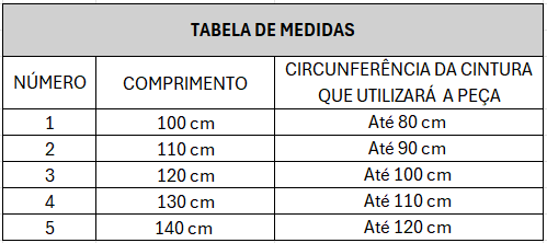 O cinto Cher é confeccionado em cinco tamanhos, conforme tabela a seguir: