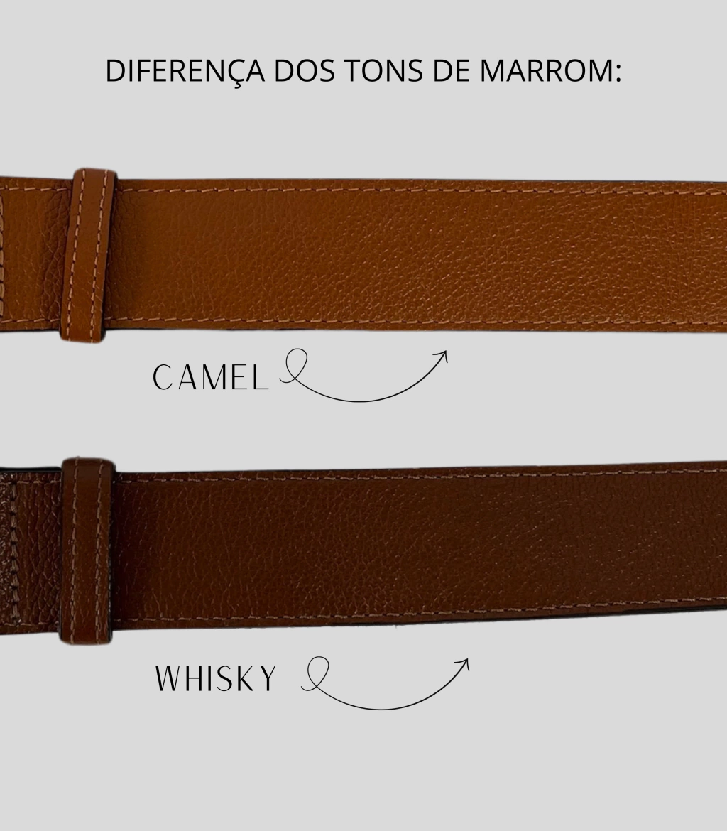 O Cinto Elo possui 3cm de largura. Sua fivela é na cor dourada e sua parte interior também é em couro legítimo bovino. O cinto pesa, aproximadamente, 85g, sendo bem levinho.